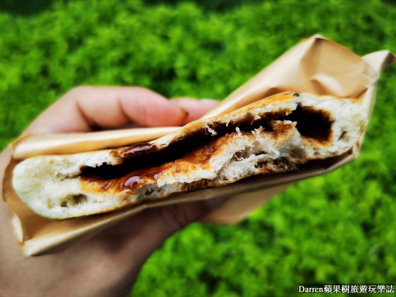 建議現點現吃當然最好吃,但可要小心會爆漿燙口唷!!紅糖餅外皮烤到微焦黃色,餅皮酥香軟綿又有Q度,越嚼越有麵粉香,裡面的紅糖會爆漿,紅糖讓餅皮內層微濕潤香甜,這時候搭配無糖綠茶真得很棒