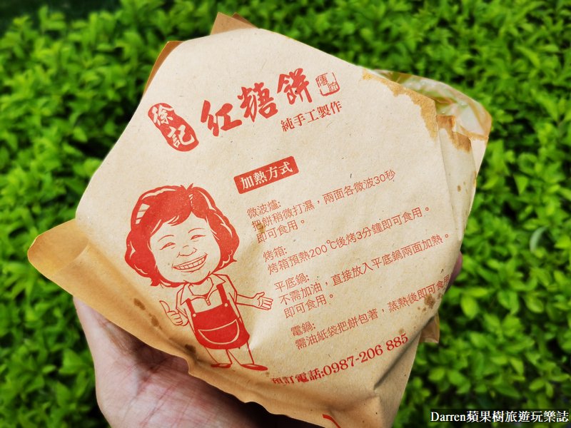 剛拿到手的紅糖餅用油紙袋包著,剛做好要小心會燙手,就連油紙袋的LOGO也多了加熱方式提醒,拿在手上還可以聞到淡淡餅香
