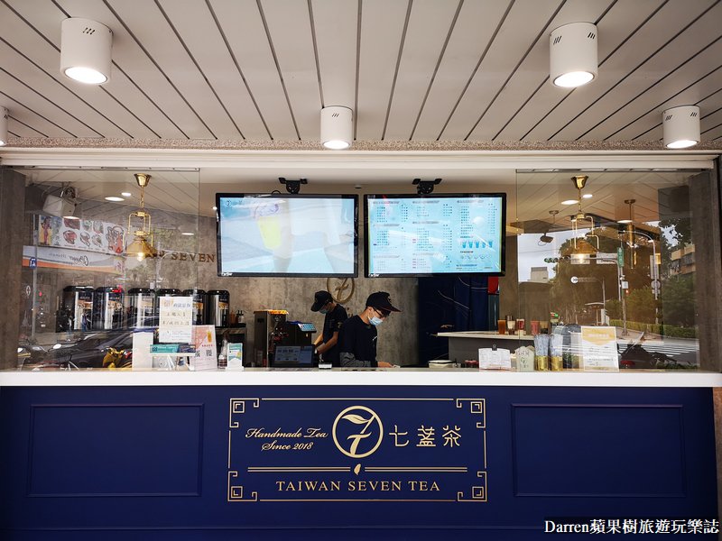 ▲七盞茶林口中山店的裝潢風格很有質感,以靛藍色為底搭配金色字體,LOGO醒目店名讓人可以快速記住,加上大理石灰的牆面,超美英倫路線簡約好拍,有別於常見飲料店,讓人眼睛為之一亮
