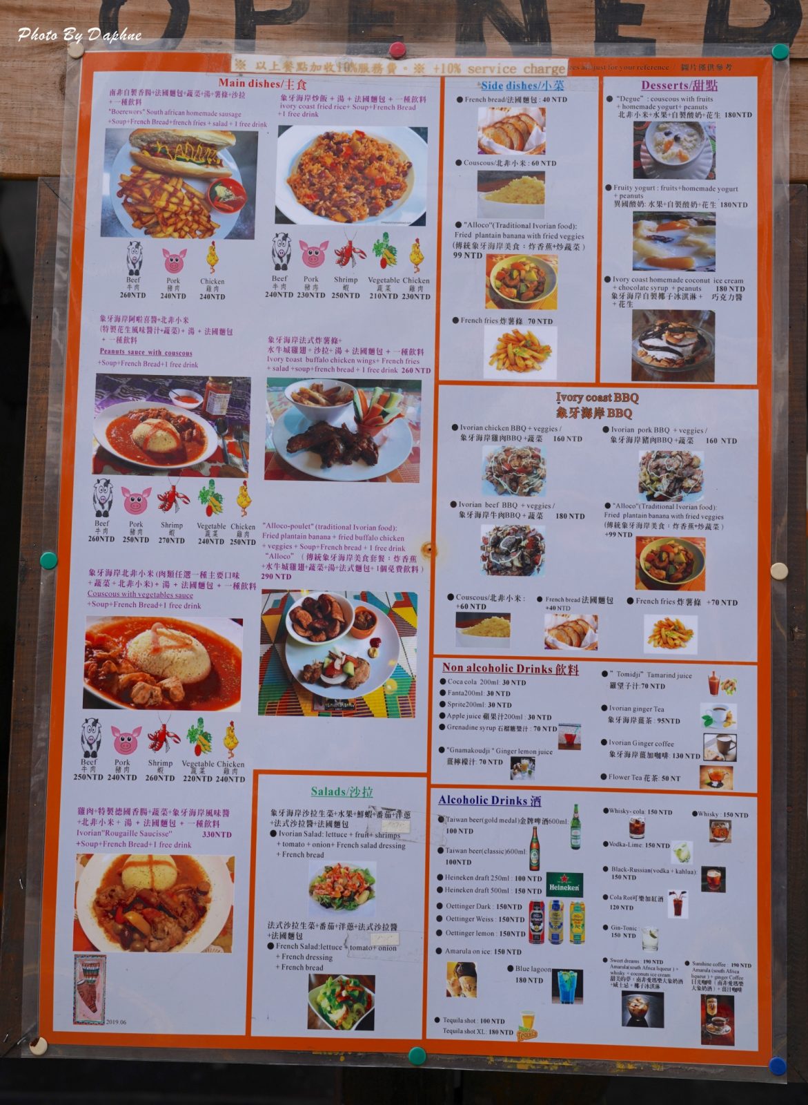 ▼菜色分成主食、沙拉、小菜、甜點、象牙海岸 BBQ、飲料、酒這幾類。多道主食也都能搭配不同的肉類跟蔬菜。套餐皆附上法國麵包、湯、飲料,飲料固定搭配美粒果果汁、可樂、雪碧、芬達四擇一,可貼差價換購其他飲料或甜點。