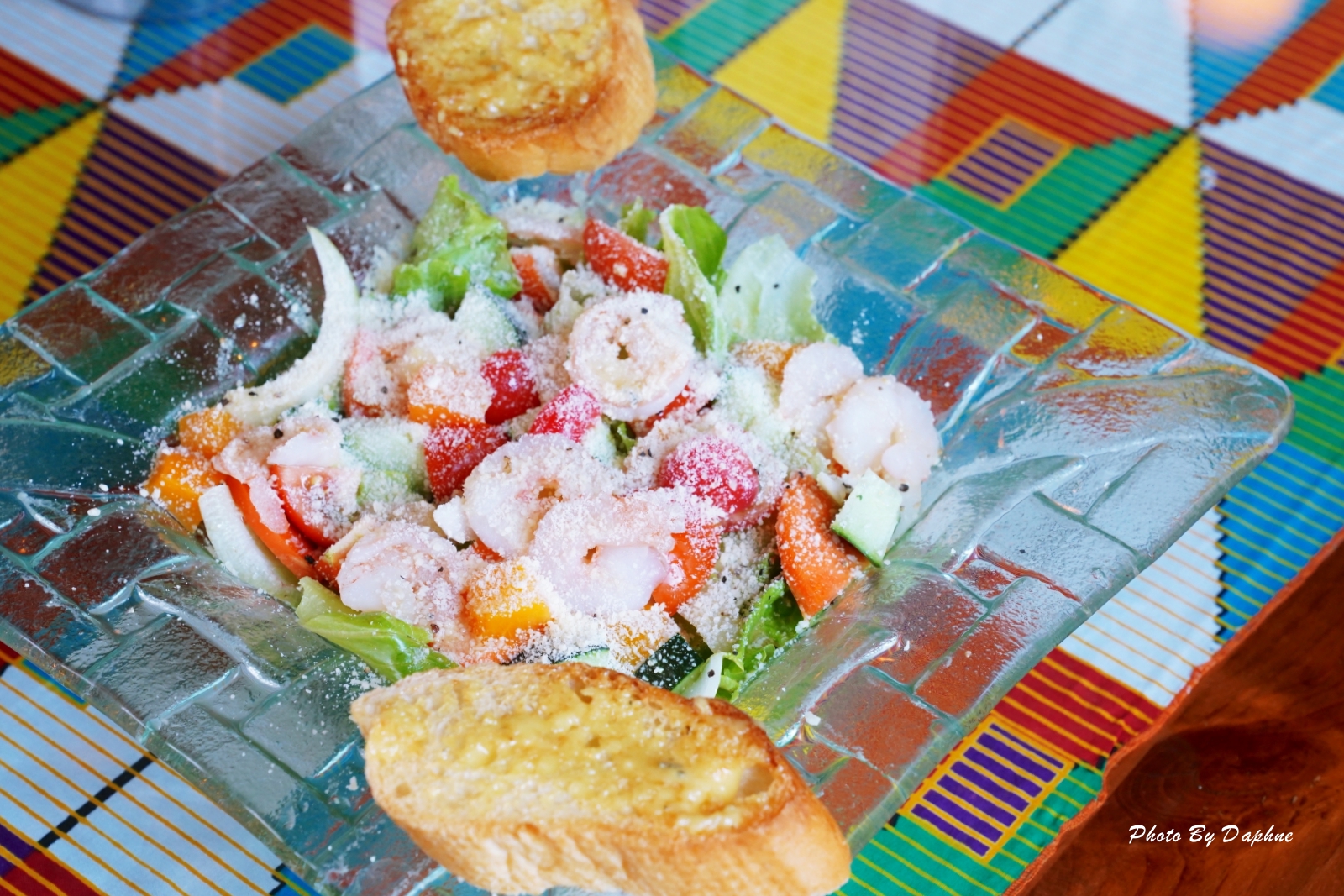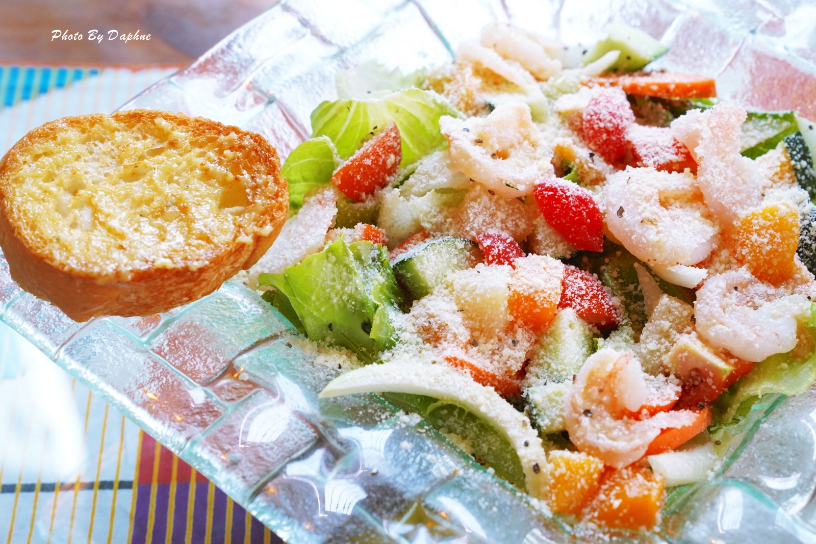 ▼份量兩個人分食剛好,食材有生菜、小黃瓜、蘿蔔、水果、鮮蝦、番茄、洋蔥等,配色豐富,食材健康,佐法式沙拉醬,口感清新不油膩、法國麵包外層香酥,越吃越有咬勁,抹上的香蒜醬鹹度恰當,香味更不用說了,很快就解決掉。