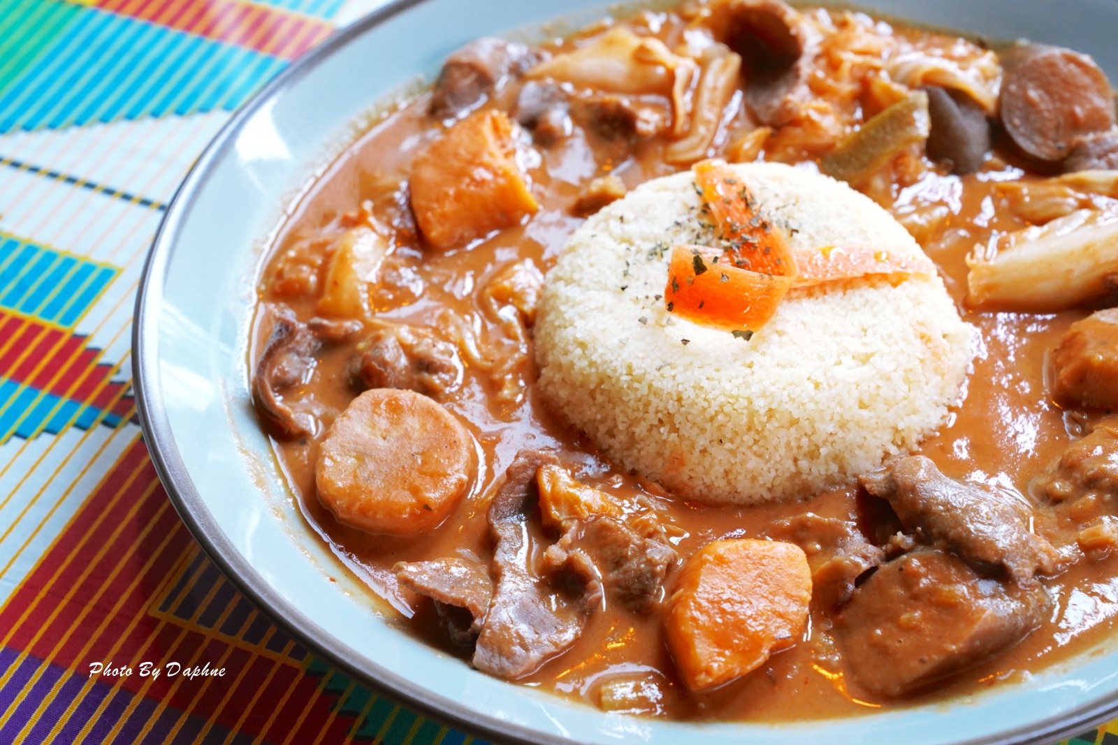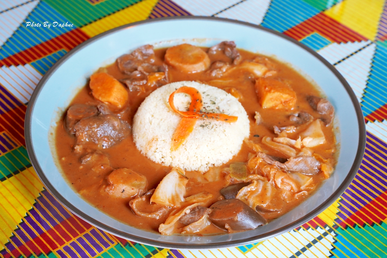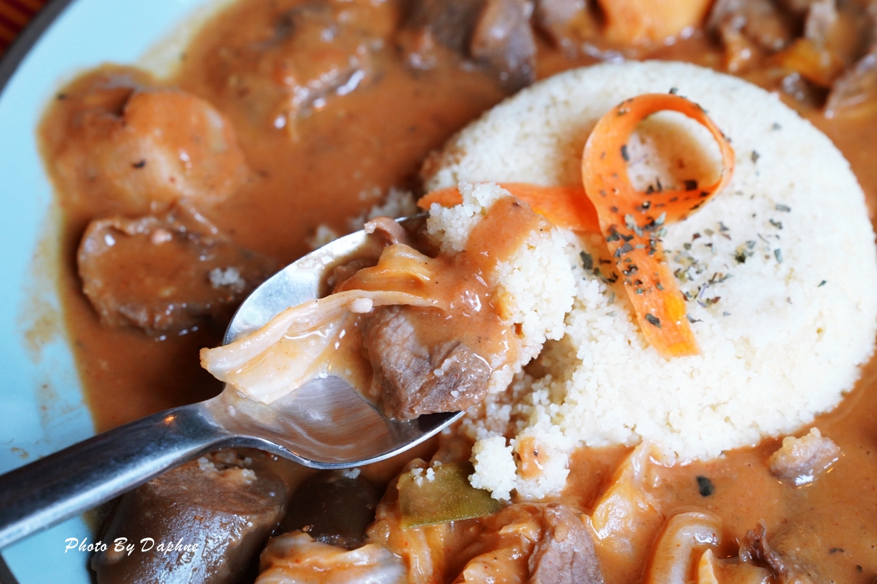 ▼象牙海岸常吃燉醬料理,喜歡在燉醬加入蔬菜,而這道是用花生醬當基底,放入番茄丁、蒜末、洋蔥丁、薑片來燉煮,配菜有蔬菜、茄子、馬鈴薯。是很微妙的菜色,除了蔬果甜味,又像有羅宋湯的酸甜蔬果香氣,還有香料味。北非小米也很特別,當地稱為「庫司庫司」(Couscous),外觀不像米飯樣粒粒分明又帶有黏度,屬於非常細小、口感綿密型。一開始吃得有點不知所以然,但是到後面越吃越開胃。