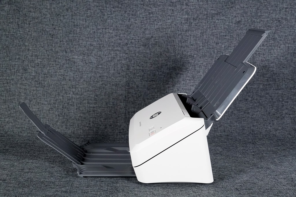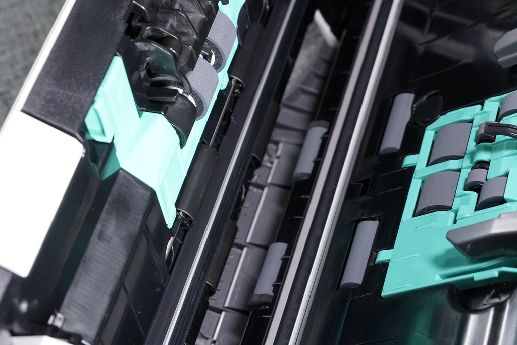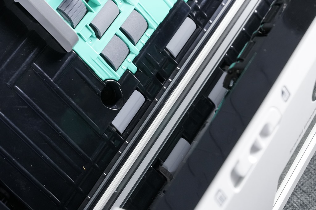 開啟上蓋後可以看到機身上與上蓋處分別都有掃描器,也就是說如果要進行雙面掃描,不用掃描兩次,直接一次通過就可以掃描兩面,掃描效率更加倍。以掃描速度來說,單面黑白掃描有著每分鐘 75 頁的速度,因為上下都有著掃描器,所以使用雙面掃描時,每分鐘可掃描 150 面。