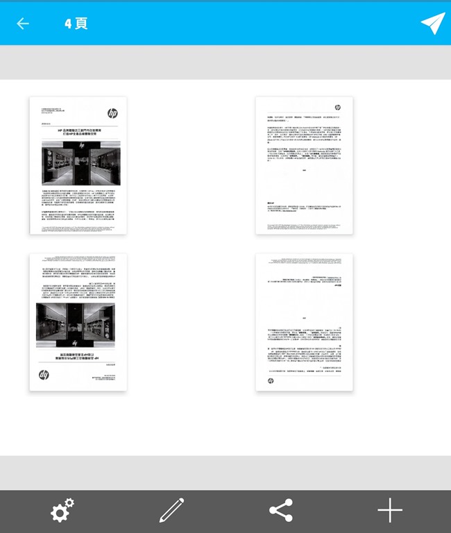 掃描後的檔案都會直接傳到手機中,無論要分享或是儲存使用都馬上可以用手機的功能開始進行,這應用讓我感到最方便的是如果有大量的文件需要閱讀,但又不方便攜帶這些文件出門,可直接用平板或手機來進行掃描讓文件直接傳入裝置中,以前面測試雙面掃描一頁只需花 0.8 秒的時間,你只要花 1 分 20 秒就可以讓這些檔案轉到你的手機或平板上,非常快速方便。