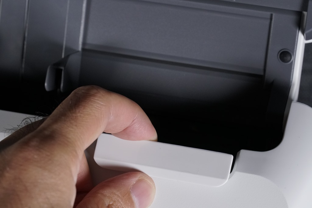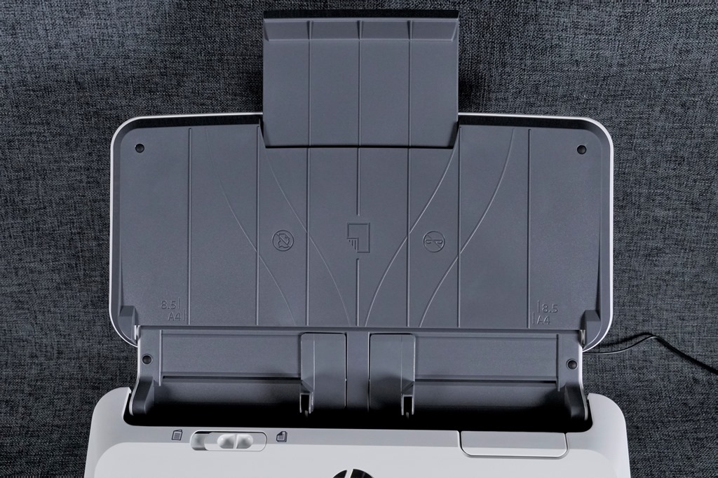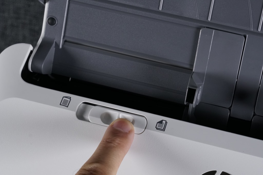 文件進紙槽最寬可放入 8.5 吋文件,以一般印表紙厚度來說,可放入 80 張紙,如果像是名片般較厚的卡紙,大約可放入 20~30 張。上方滑動是卡紙板可讓文件更整齊地擺放,在掃描時更整齊。
