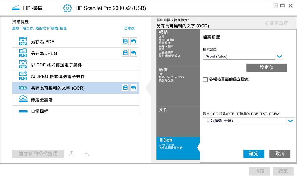 內建的 OCR 軟體也非常便利,辨識度也同樣優異,也同樣可以指定掃描辨識後的檔案格式,與指定儲存路徑。