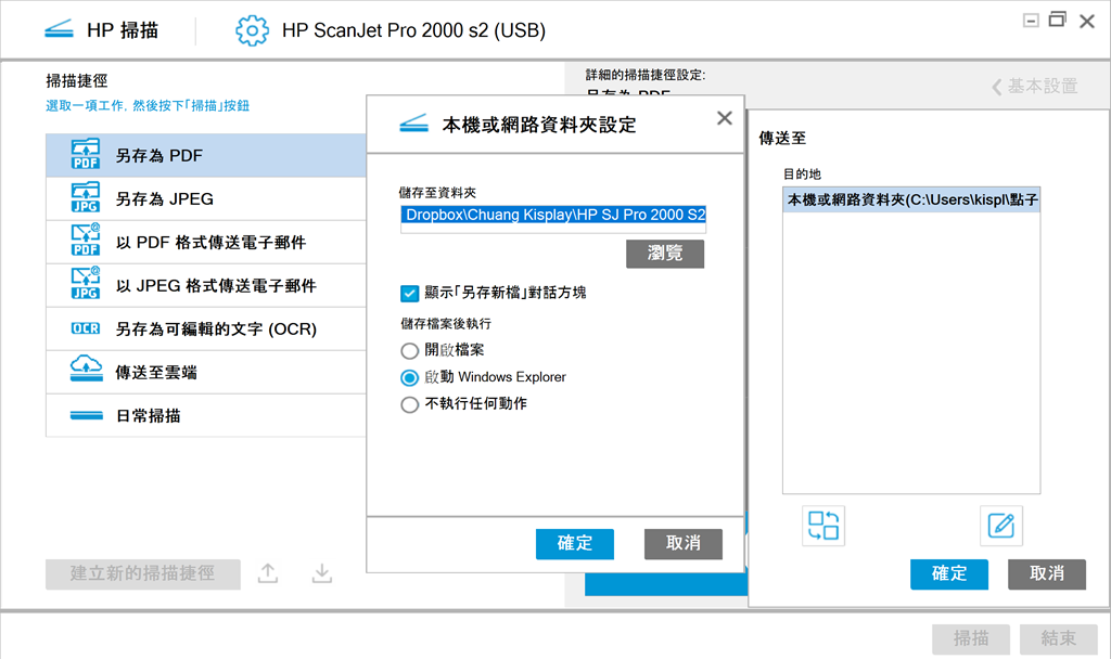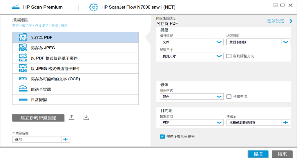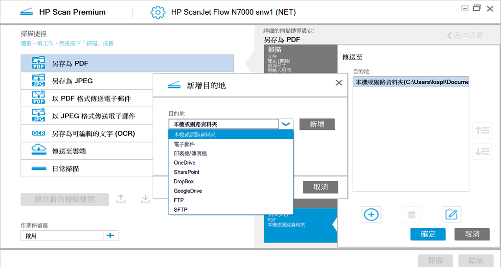 左側有著許多掃描功能捷徑,你也可以依照自己常用的方式建立新的掃描捷徑。掃描後可以直接存至電腦中,也可以傳送到各式目的地,如電子郵件、印表機、DropBox、Google Drive、FTP…等,每個功能都可以依照說明書來設定,這邊就不再贅述。