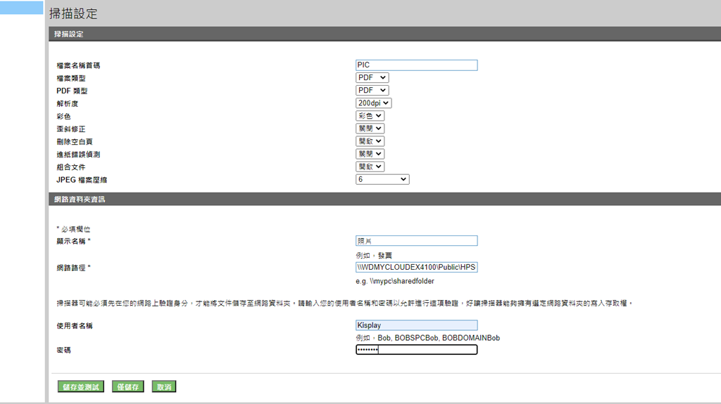 接著就到網頁設定介面上調整預設掃描設定,例如檔案名稱首碼、解析度、掃描後檔案類型、彩色或黑白、單面或雙面掃描…,這些設定在操作掃描器時都可以再次設定。最重要的是要填入顯示名稱,也就是設定後你會在掃描器上看到的指定位置名稱,如果說這資料是指定到 Kisplay 的專用資料夾,就可以填入 Kisplay 讓使用時更好辨識。接著就輸入指定的網路路徑,以下圖來說,是要掃瞄照片到照片的網路資料夾內,這時你就把照片專用的網路路徑放上去即可。