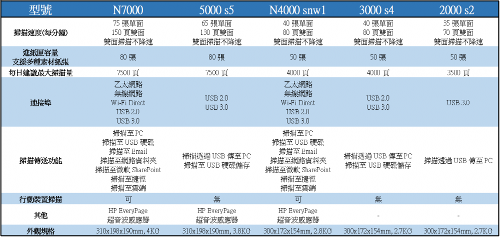 前面兩款特別介紹的分別是旗艦款 HP ScanJet Enterpise Flow N7000 與入門款 HP ScanJet Pro 2000 s2 饋紙式掃描器,中間還有多款掃描器可選擇,像是同樣有著網路功能的 HP ScanJet Pro N4000 snw1 饋紙式掃描器,或是掃描速度更快的 HP ScanJet Enterprise Flow N7000 商務級掃描器、HP ScanJet Enterprise Flow 5000 s5 商務級掃描器都是高速掃描的機種,入門級的 HP ScanJet Pro 3000 s4 饋紙式掃描器也提供電腦桌上使用另一個選擇,最後直接將功能與規格列表分享給大家。
