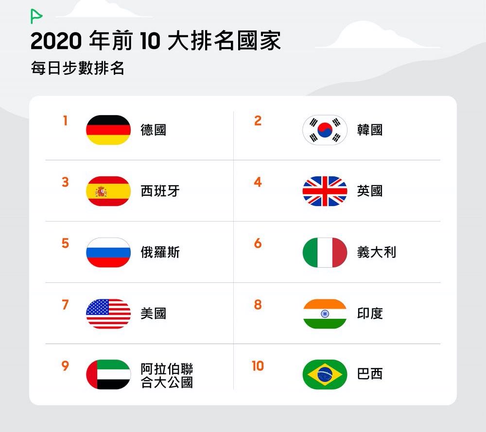 至於全球的步數排名,第一名由德國拿下,接下來分別是南韓、西班牙、英國、俄羅斯、義大利、美國、印度、阿拉伯聯合大公國與巴西。