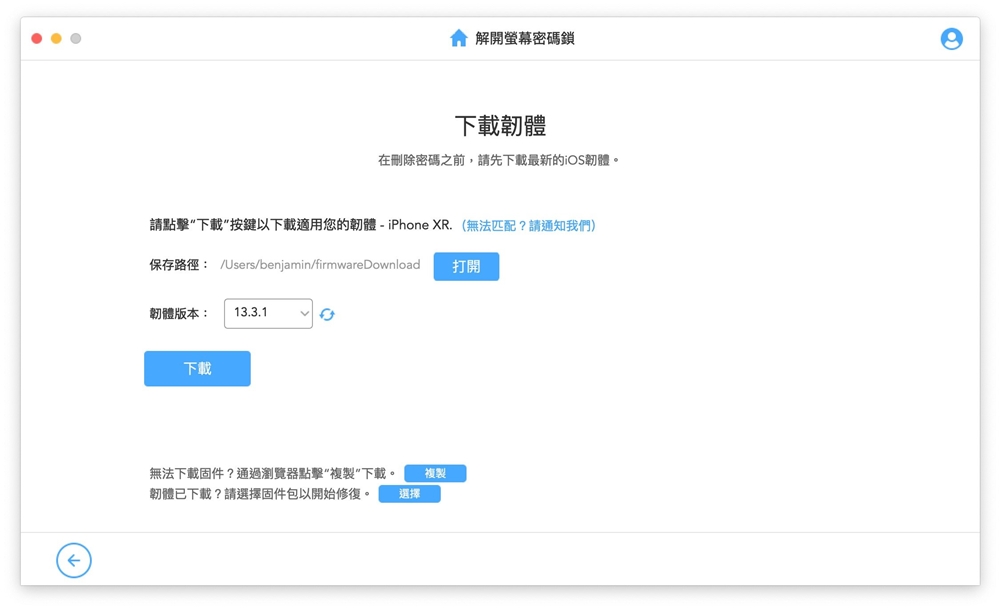 步驟2:軟體會自動偵測裝置的模式,提供對應的韌體套組,下載後只需要解壓縮並啟動就可以了。