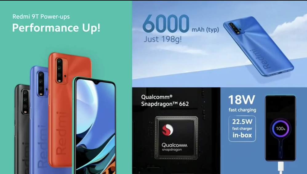 發表會上還帶來了另一款有著 灰、紅、藍、綠四色的 Redmi 9T,使用高通 S662 處理器、 6.53 吋螢幕、有 6000mAh 電池容量 48MP+廣角+景深 三鏡頭、18W 快速充電、支援 NFC、3.5mm 耳機孔、防潑水等特色。