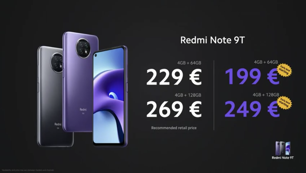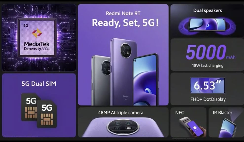 相當迅速的,小米在 2021 年為旗下紅米 Note 9 系列帶來最新成員 – 紅米 Redmi Note 9T。Redmi Note 9T 也是 Redmi Note 系列中首款 5G 的成員,而且直接配置 5G+5G 雙卡,共有紫與黑兩色。並同步帶來繽紛四色的 Redmi 9T。