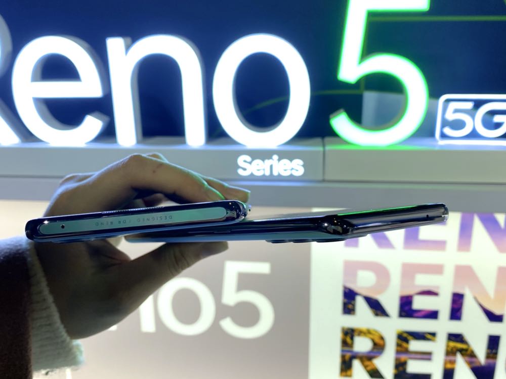 兩款這次都有黑色與幻彩銀兩色,外型上的分別就在 Reno 5 Pro 頂部有著平面的螢光條,Reno 5 Pro 的螢幕也是曲面螢幕,而 Reno 5 則是平面螢幕。