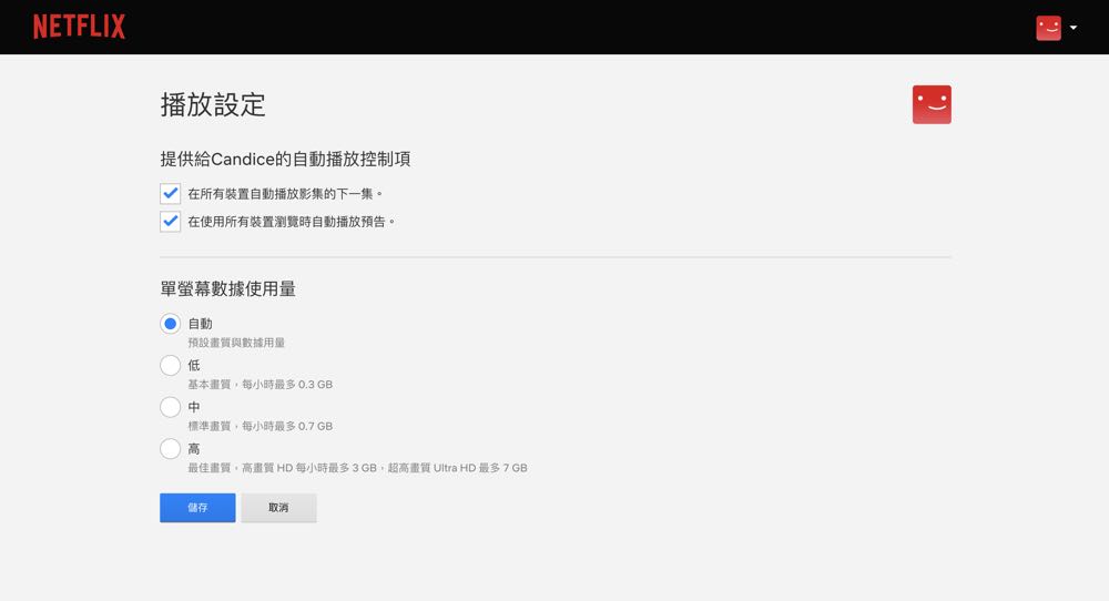 2) 從 NETFLIX 官網:進入 NETFLIX 後如果有多個帳號,就找出自己的帳號 >>> 選擇「播放設定」>>> 再選擇「高,最佳畫質」的選項。