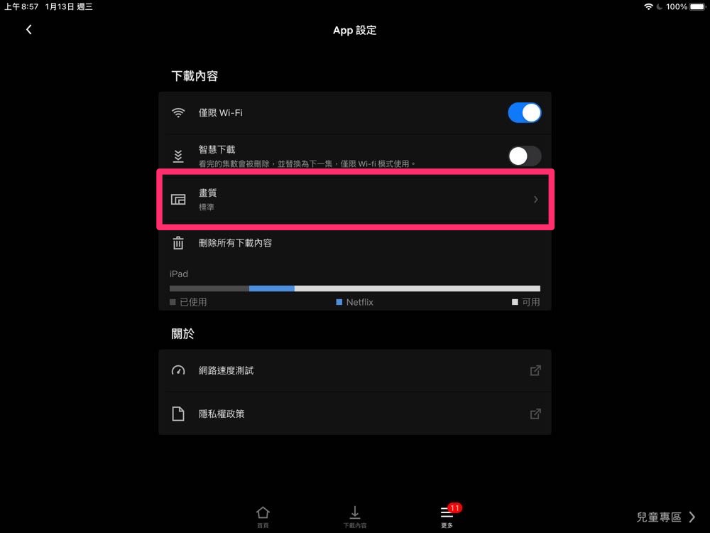 1) 手機/平板: 進入 NETFLIX app 後選擇 APP 設定 >>> 「畫質」>>> 切換到「較高」