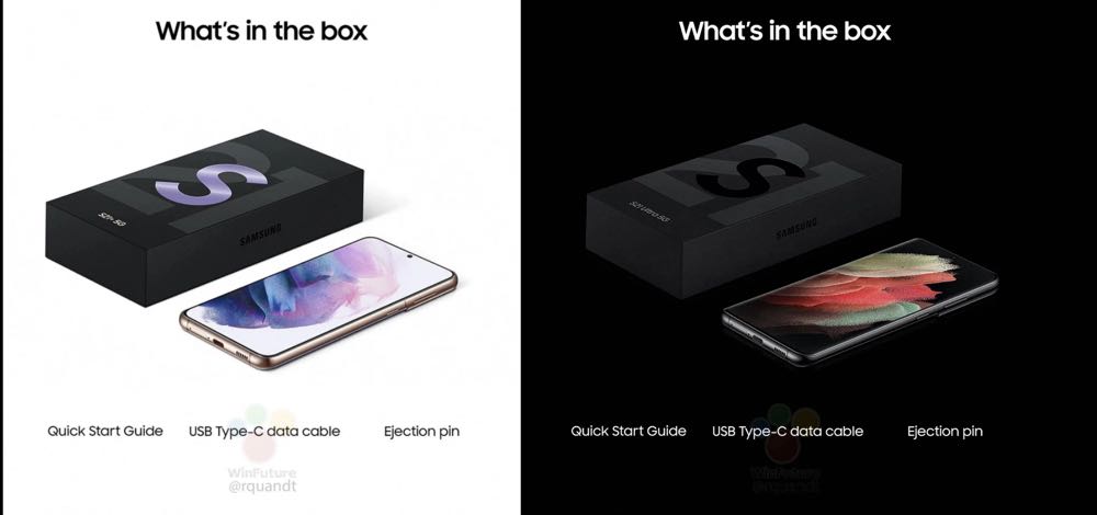 根據外媒《WinFuture》的消息,這個沒有公開的官網是寫著「What’s in the box」,然後顯示 Galaxy S21 與 Galaxy S21 Ultra 兩款的包裝盒中除了手機本身外,還將會保留使用指南、Type C 充電線與退卡針,也由於拿掉了充電器與耳機,包裝上就像是 iPhone 12 系列一樣整個尺寸變小了一號。