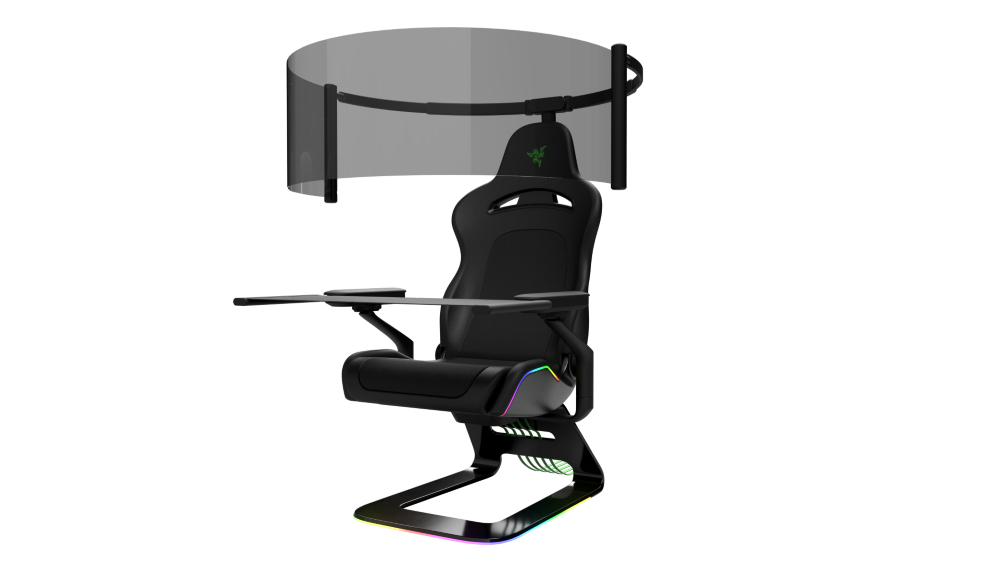 雷蛇另一款概念設計「Project Brooklyn」,是針對所有類型的玩家設計,椅子本身結合人體工學設計,採用碳纖維材質、RGB 燈效,加上一個 60 吋的環繞式 OLED 顯示器,更棒的是,這款椅子還具有震動回饋功能(沒錯,用的是雷蛇去年 CES 展示的 HyperSense 聲音驅動震動回饋技術)!另外,考慮到主機玩家,椅子的 4D 把手與前方的摺疊桌可收起;PC 玩家可將桌子放下好可擺放鼠鍵,設計相當周到。