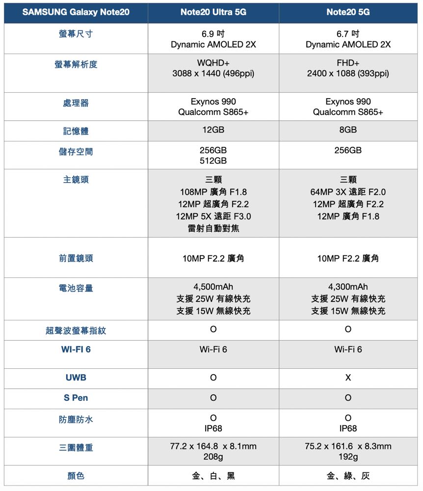 最後也附上 Galaxy Note 20 系列與 Galaxy S20 系列的規格比較表給有需要的朋友參考。