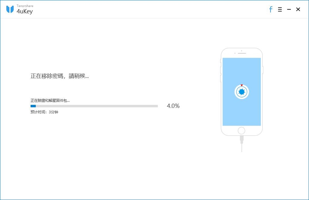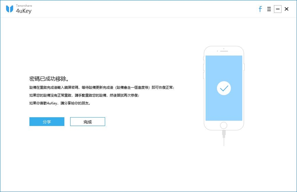 步驟 5:此時 4uKey 正在移除 iPhone 密碼,點擊「完成」後,就已經成功解鎖 iPhone,手機將會自動重開機,而 iOS 系統也會被重灌,回到原廠模式。