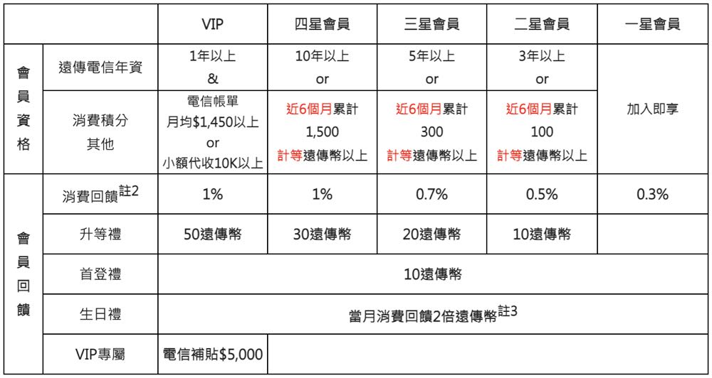 二星會員: 電信年資 3 年以上 或是 近 6 個月累計 100 計等遠傳幣以上