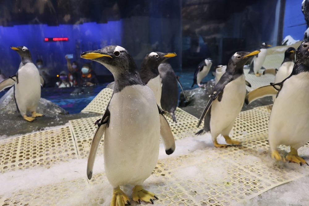 企鵝為群居動物,屏東海生館企鵝展示缸中共有 4 種不同種的企鵝,包含阿德利企鵝,身長約 30 至 50 公分,頭部以黑色為主,眼周呈白圈,是世上最耐寒的企鵝之一;馬可羅尼企鵝外觀最明顯的特徵就是頭頂有長長的金黃色羽毛,又稱長冠企鵝,為冠企鵝屬成員之一;巴布亞企鵝眼睛上方有白色三角形斑塊,從上方看很像打著白色領結,所以又被稱為紳士企鵝,是目前已知游泳速度最快的企鵝;第 4 種為頰帶企鵝,身長 60 到 70 公分,頭部下方有條條黑色的紋帶,看起來就像帶著黑色頭盔一樣,是南極中最常見的企鵝種類之一。