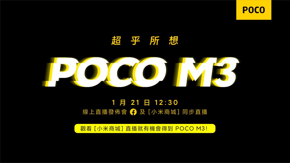 日前,POCO 宣布以獨立品牌之姿進軍臺灣市場,品牌現在宣布,將於 1 月 21 日(四)舉辦「POCO M3 臺灣線上直播發表會」,首次向臺灣消費者介紹品牌精神,以及新的智慧型手機 POCO M3。此外,發表會中將發送專屬限量折扣碼,有興趣的毒讀者屆時可前往小米商城 mi.com 觀看直播。