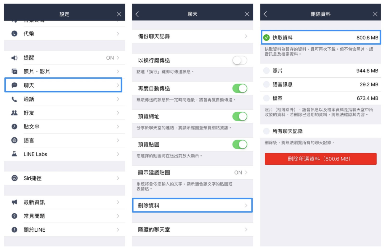 LINE 主頁左上角點選「設定」(圖示為小齒輪) >>>「聊天」>>>「刪除資料」>>>「快取資料」