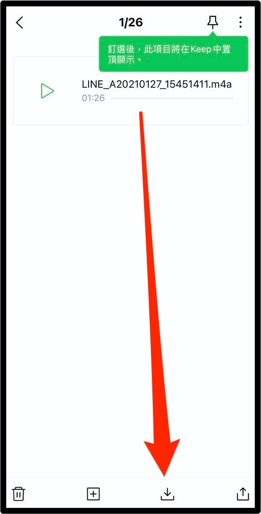 - 進入 「Keep」後找到剛剛的語音訊息,這時便能點選想要下載的語音訊息,再選擇要下載存放的位置就好。