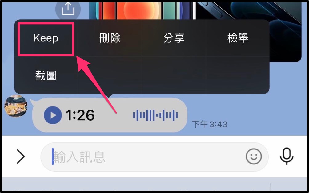 - 看到想要存檔的語音訊息時,只要長按住語音訊息,就會出現「Keep」、「刪除」、「分享」、「檢舉」和「截圖」,選擇「Keep」 後再儲存。
