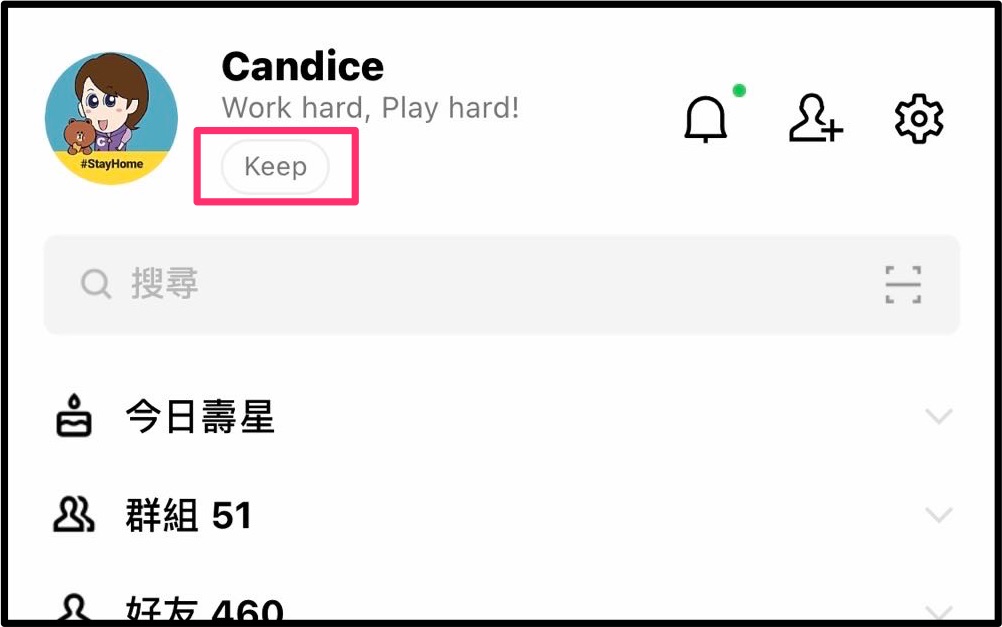 - 接著回到 LINE 首頁,這步驟其實也是最容易被忽略的地方。原來就在個人名稱下方有個小小的、淺淺的「Keep」,這裡… 就是「Keep」的大本營!