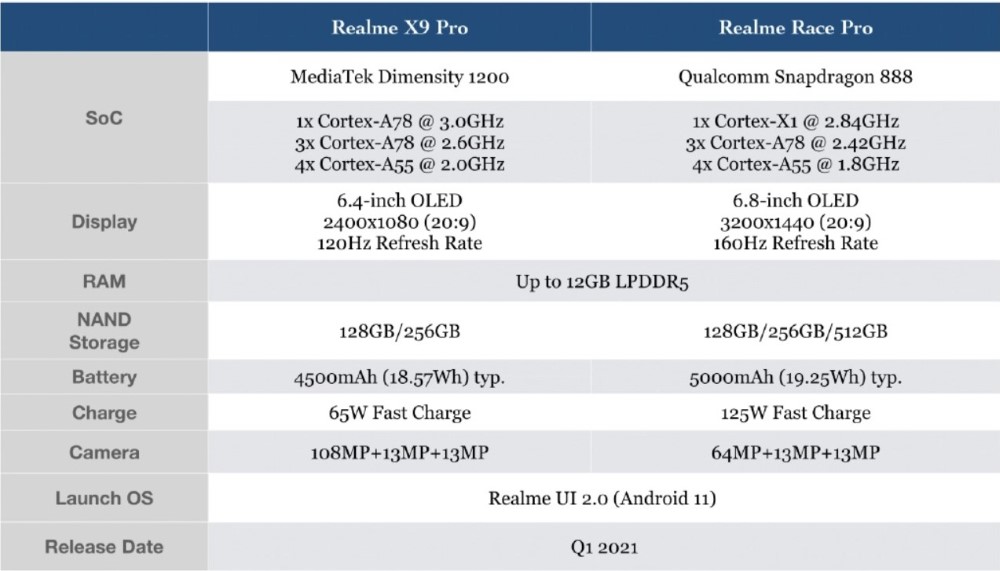 根據這份外流規格表,realme Race 預期搭載高通最新的 Snapdragon 888 處理器,記憶體最高為 12GB LPDDR5,儲存容量有 128 / 256 / 512 GB 可選,並且具有 5,000mAh 大電池,搭配 125W 閃充。背面相機則為 64MP + 13MP + 13MP 的三鏡組合,詳細規格目前還無法確認。