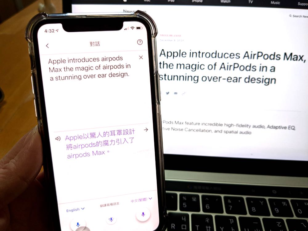 根據測試,「對話翻譯」的速度其實就像是即時翻譯,不論是人聲正在進行的對話,還是用平板、電腦等進行,只要在麥克風的收音範圍內,就能用即時翻譯的速度來進行。雖說翻譯的精準度上還是有著些許的不足,但若是對在街上遇到國外民眾用完全不熟的語言來問路的時候,或多或少還是能夠幫的上對方的忙呢!