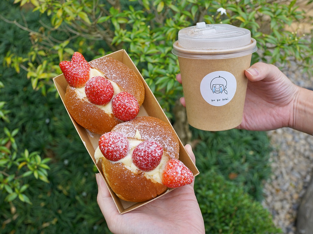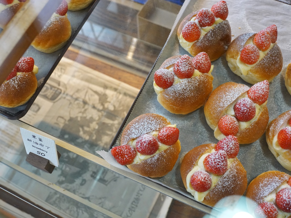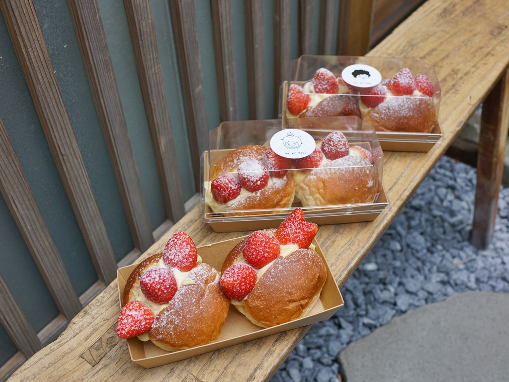 最後大家都買了草莓口味,瞬間變成草莓園的畫面,還以為我們多愛吃草莓咧!有了自身(受害)經驗,可以跟大家分享一下,目前試營運期間,餐包出爐時間大約是早上八點以及下午兩點至三點,建議大家可以這兩個時間到,幾乎都是出爐一小時內就會賣光,如果不善排隊等候者,真心建議可以過一陣子再來,單純買咖啡免等待~