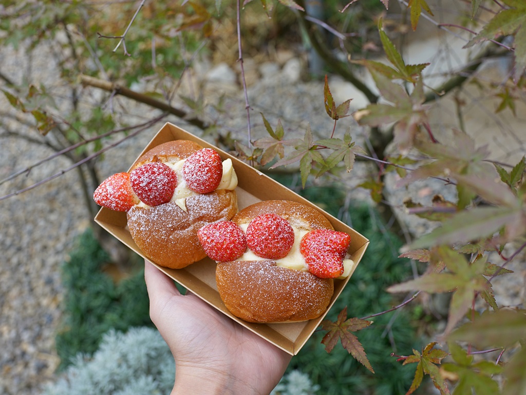 將餐包烤過加熱後切開,夾入飽滿的布丁奶油餡與新鮮草莓,看起來超好吃但吃起來還好,我覺得麵包口感偏乾,草莓偏酸,其中布丁奶油餡最好吃,不甜不膩也讓麵包更好入口,而且一個只要50元有夠讚,順路經過看到可以買,但沒有好吃到要特地去或排隊兩小時,真的不值得啦,想到又忍不住哭哭了