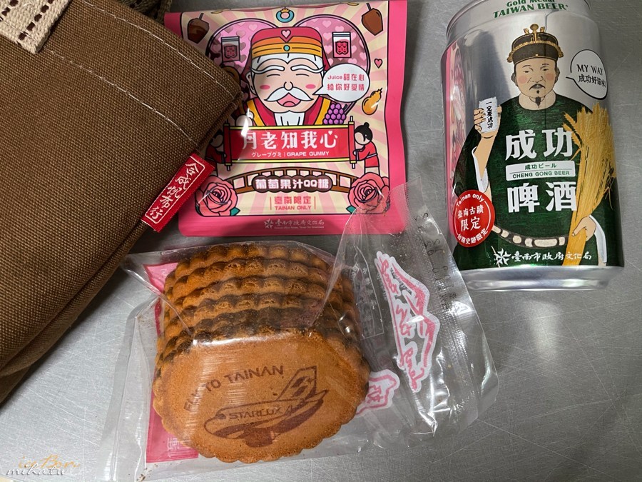 下機還有地勤在接機大廳發送台南特色禮袋, 包含:星宇x台南市Logo帆布包、星宇x台南市府限定版煎餅(超好吃!聽說平常要買要排隊之外一個人還只限購兩包)、台南限定成功啤酒(荔枝口味) 、月老知我心軟糖
