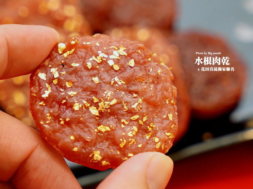 2021過年禮盒幫你準備好了!!【水根肉乾】跟花田喜彘聯名打造的限量禮盒「 24k頂級金箔&國寶級綿羊豬肉乾禮盒」不僅典雅又貴氣,而且選用台灣純正豬肉,60年職人手作肉乾搭配米其林餐廳指定食材國寶級綿羊豬,加上日本金澤24k金箔肉乾,聯手打造出不凡品味的頂級禮盒,不僅送禮大器好看,也很適合款待心中最重要的人!!金箔肉乾吃起來調味不會過於甜膩,沒有添加嫩精、香精,吃得到豬肉的自然香甜;綿羊豬肉乾採用西餐手法,加上紅椒粉、奧勒岡調味,吃起來帶有香料香氣,更襯出綿羊豬的甘醇甜美,兩種都好吃!