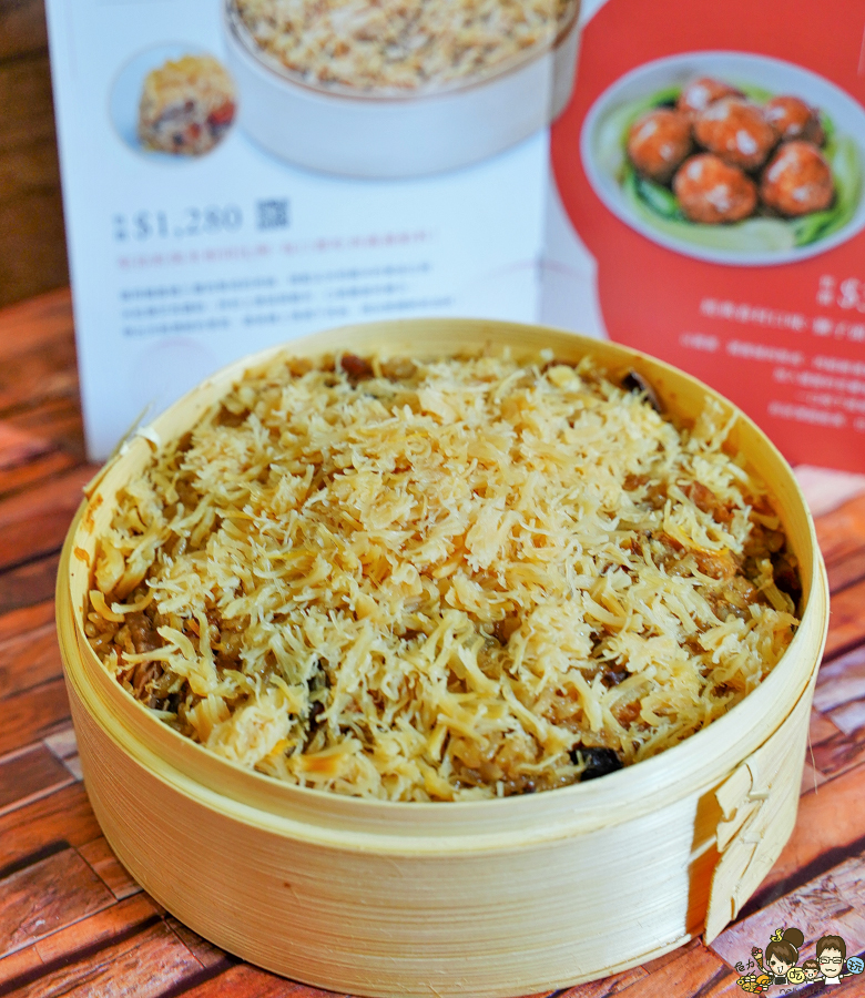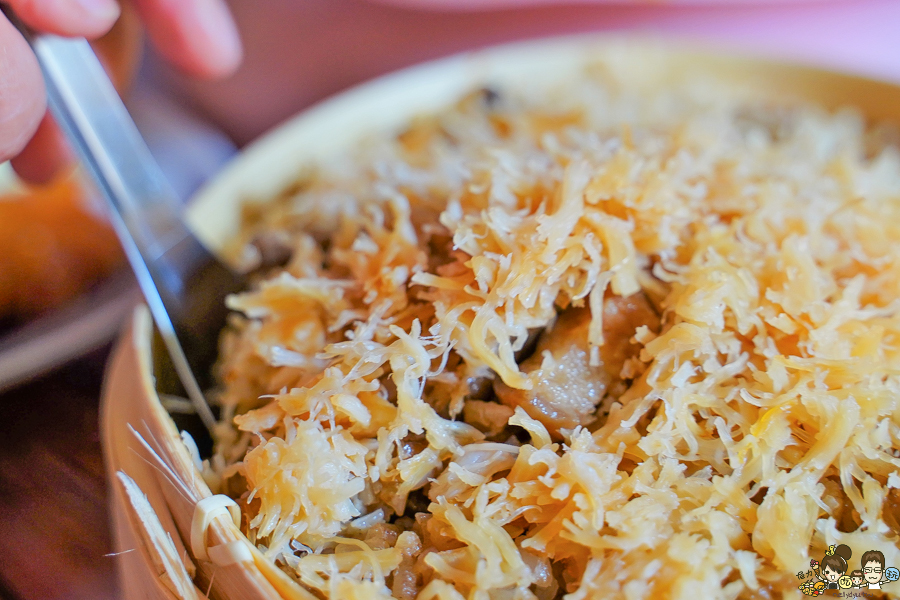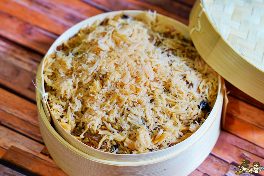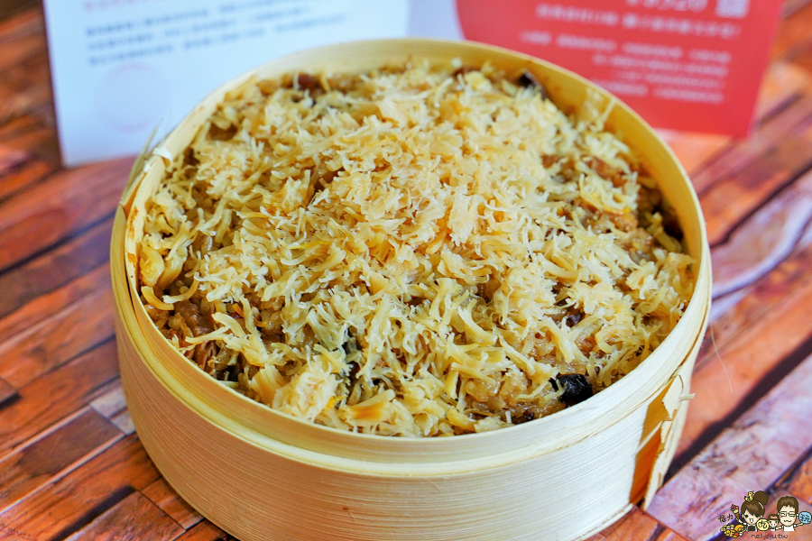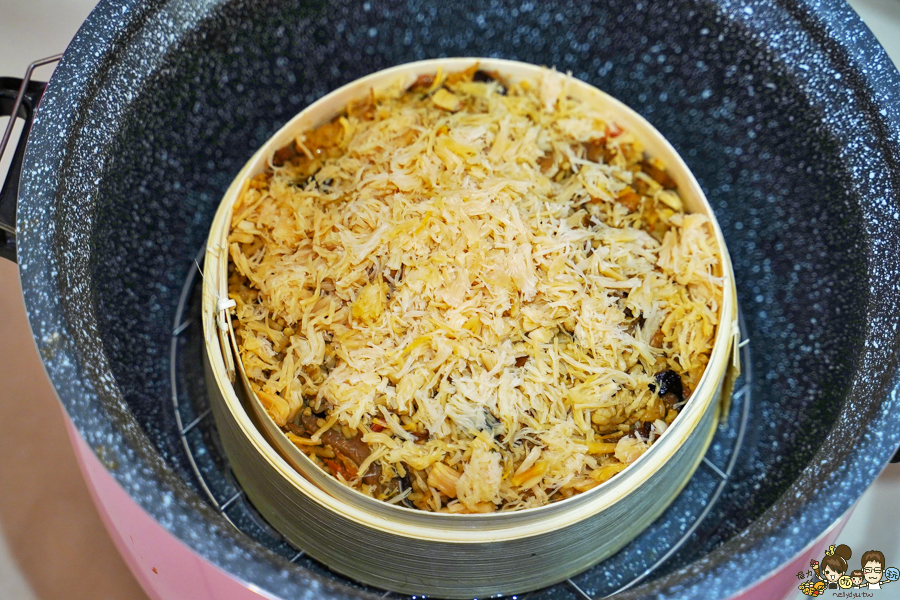 眷村干貝米糕,使用蒸籠裝,直接覆熱就可以整個端上桌,還保有懷舊古早味