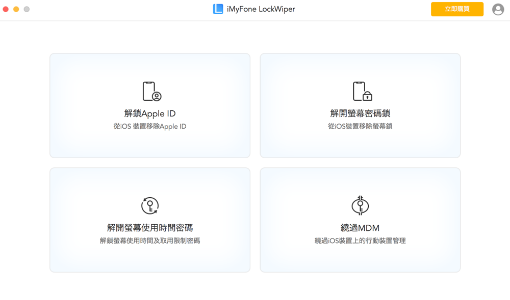 步驟1:下載並安裝 iMyFone LockWiper ,開啟軟體後,會出現四個選項,點選右上角「解開螢幕密碼鎖」,並且連結到你的 iPhone。