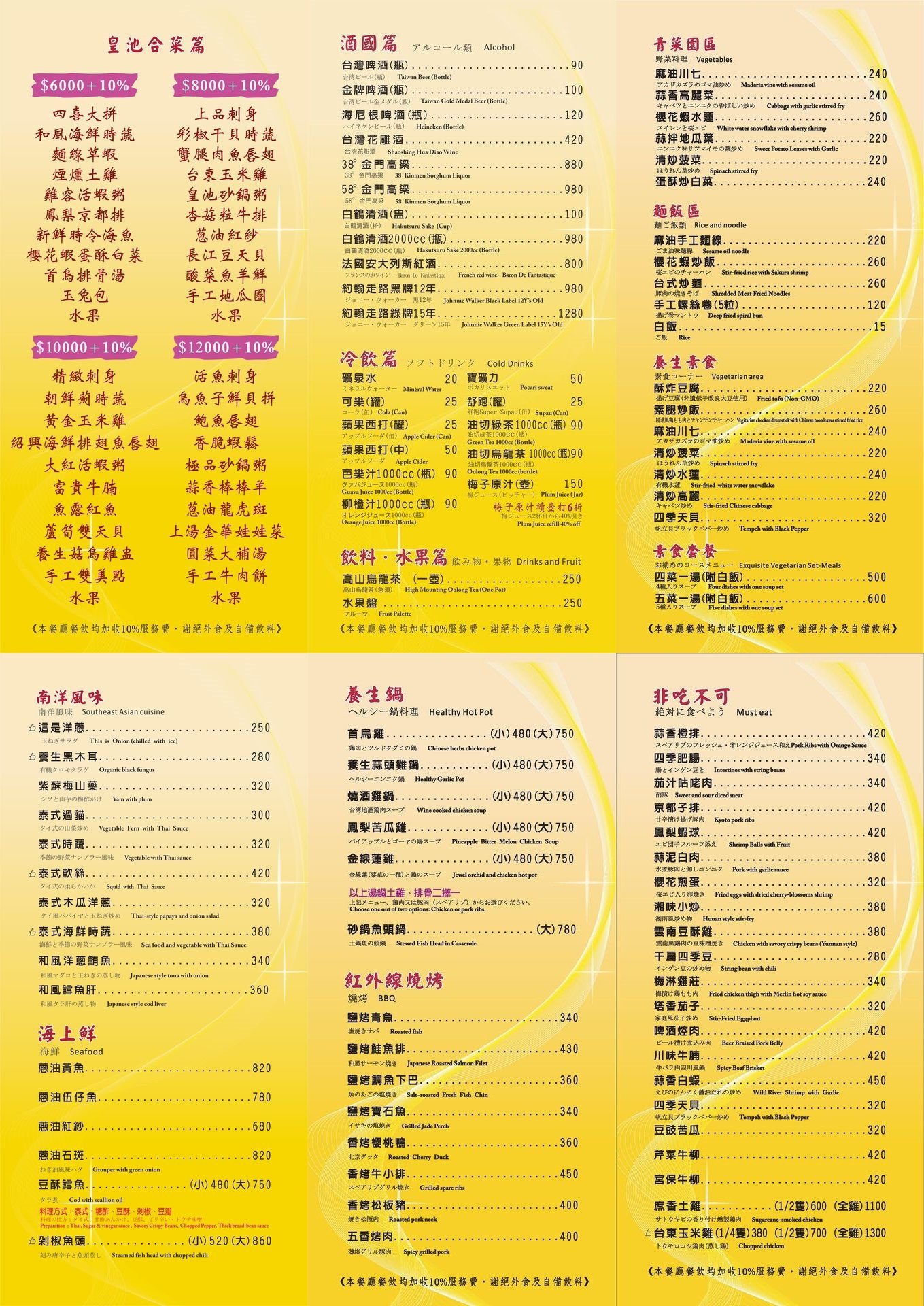 皇池溫泉御膳館菜單MENU有砂鍋粥、砂鍋粥單點食材、手工點心、鮮魚刺身、鐵三杯、中日風味、非吃不可、好吃的酸白菜、養生鍋、紅外線燒烤、南洋風味、海上鮮、青菜、麵飯、素食等等