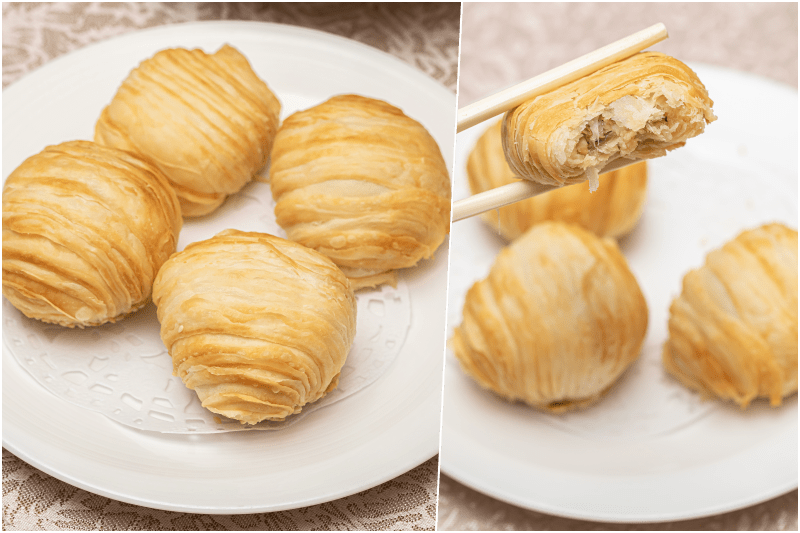 這是外酥內多汁的蘿蔔絲酥餅(120元,份),大口一咬鬆化又美味,裡層的蘿蔔絲爆汁香甜,趁熱吃真的超棒!