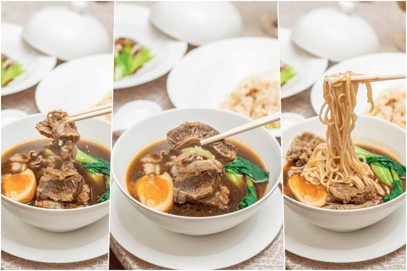 再來的壓軸,自然就是超級美味也很有特色的椒香牛腩雙饗麵,一上桌的時候,湯頭的部分還未加入