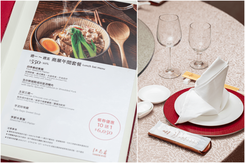 這次的牛肉麵,其實出自於台北福華江南春商業午間套餐(550元再加一成,週一至週五午間供應),另外呢,江南春也有餐券優惠可以讓大家更划算唷!買10送1含服務費只要6050元(不銷售單張餐券)