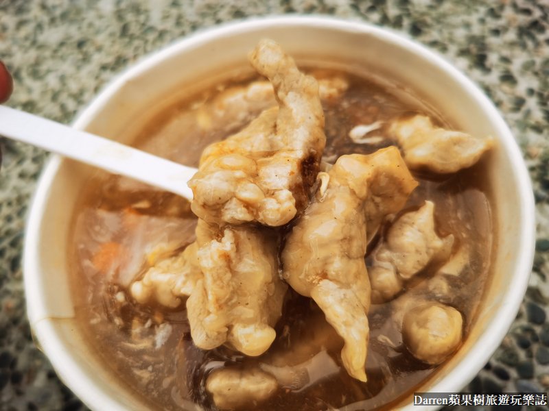 肉羹湯55元用湯匙舀起裡頭的肉羹,有別於常見用肉漿或魚漿包裹肉羹的口感,簡單來說就是整條粗肉絲的赤肉羹,咬起來略帶嚼勁,整碗肉羹湯料多實在湯頭清甜,也算是好吃的肉羹湯