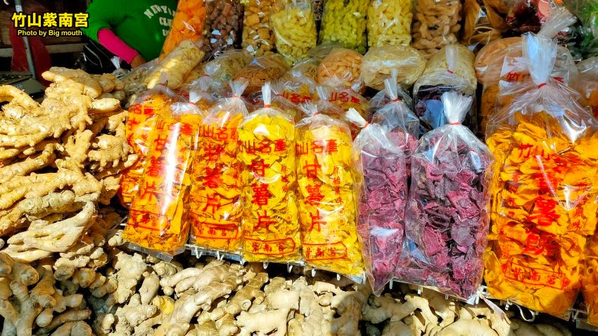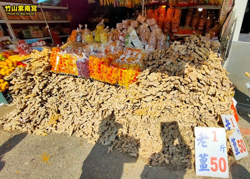 ▼廟邊這間販售老薑的攤位也莫名的吸引人,位置幾乎都快被老薑給佔滿,中間也有販售一些零嘴餅乾!我們也買了一些老薑回去煮薑茶,這裡有分為兩年半跟三年的老薑,大家挑選完再給店家秤重即可!