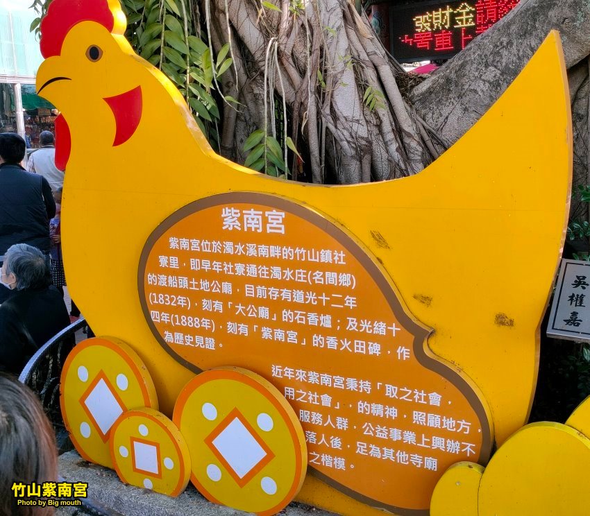 ▼樹下的金雞告示牌也有紫南宮的歷史簡介,最早可追溯到清道光、光緒年間,整個歷史悠久啊!