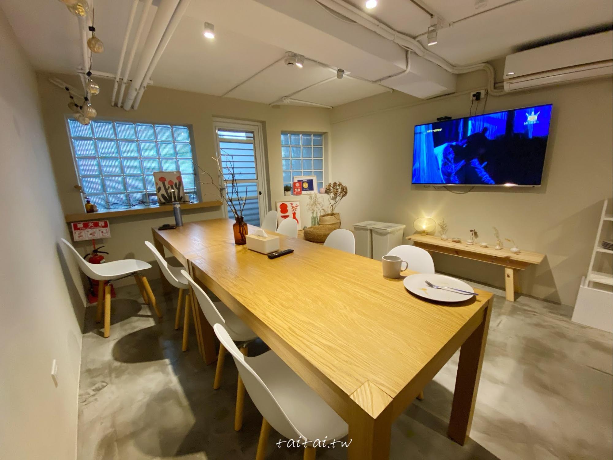 旅客才能進入的第二進,則要更換室內拖鞋,換完拖鞋後進入第三進,有小小沙發茶几,Check-In時,工作人員會端上熱茶、並請我們在此填寫入住資訊。這一區也有一張大書桌、高腳桌椅數張,辦公時間內工作人員都會在此駐點。最後面還有一間廚房兼餐廳,待會要講早餐再一起放圖。總之整體走一個簡潔明亮的無印良品風,搭配適度保留的老花磚地板,絲毫沒有老旅店陳舊感。