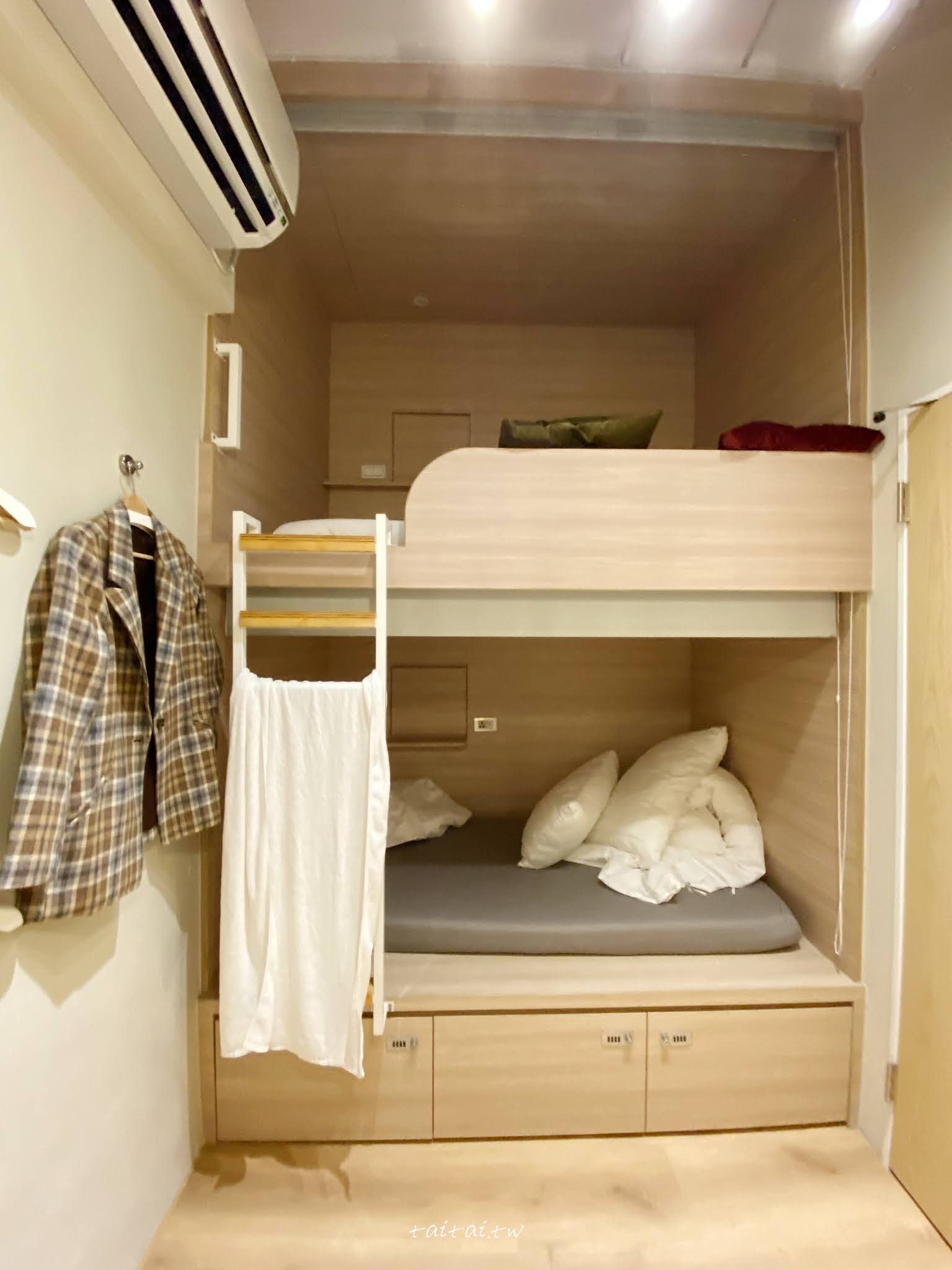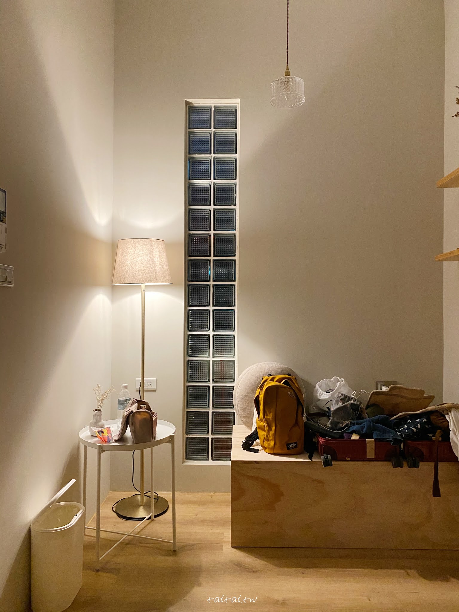 根據建築物的形狀,我推估應該只有套房的房型有對外窗,兩人背包房是以透明玻璃磚來帶進採光,床架是固定在牆上的那種,所以不用擔心爬上爬下時會有嘎吱嘎吱的聲音。此外還有一張小小的座位區(被我拿來放行李)以及空調,床墊是記憶枕薄墊那種材質,睡起來感受為中上。
