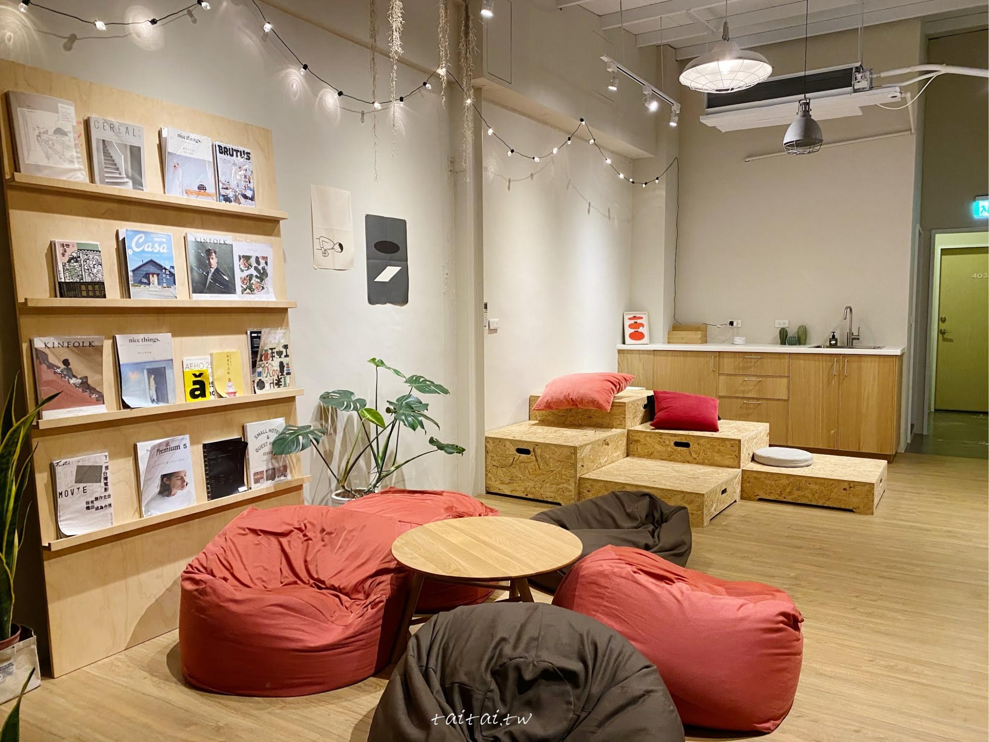 公共設施還沒介紹完呢。番茄溫泉旅店的四樓還有一個超慵懶的小客廳,放置一些設計、質感旅行相關的刊物與書籍,以及軟綿綿的懶骨頭、小茶几!不過我不是在這裡放鬆…而是在此工作到十二點才回房間睡覺。