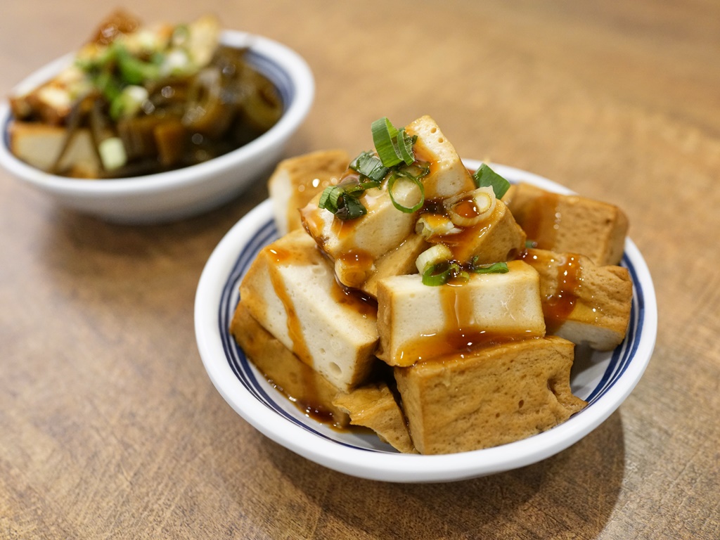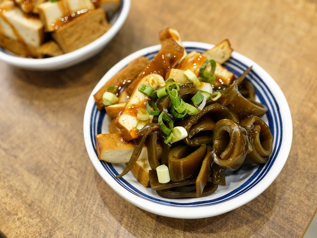 我們拿了兩盤30元的小菜,分別有豆干+海帶,以及一整盤的百頁豆腐,他們的滷味應該是煙燻過,單吃就蠻有味道,百頁豆腐很好吃,不過醬油膏淋太多了好鹹,建議店家少加或不要加,醬料可另外附讓客人依喜好沾取~